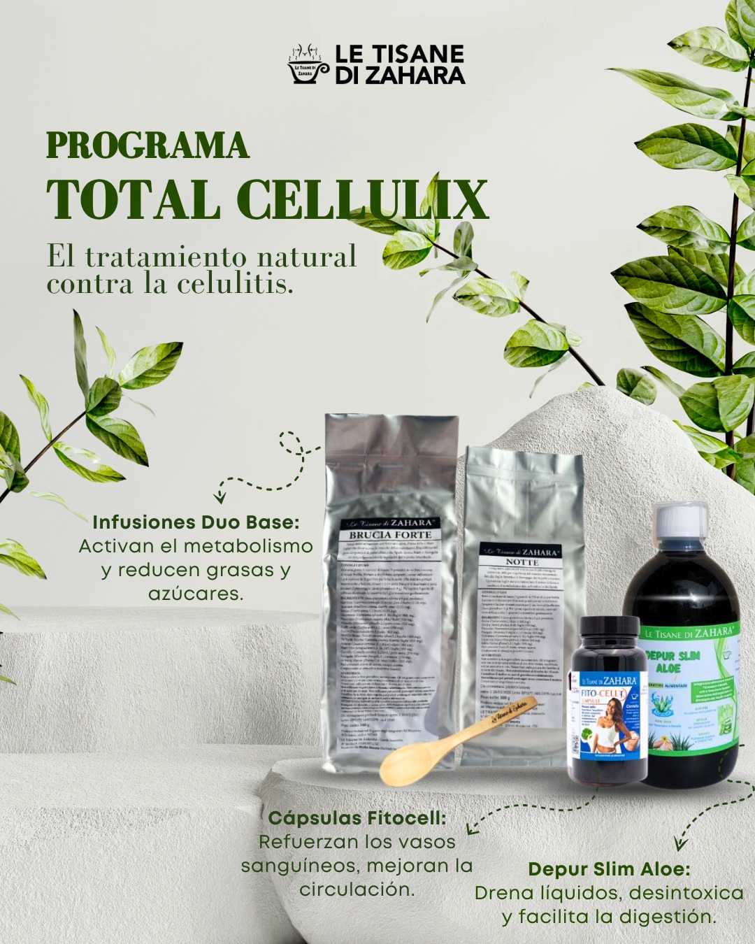 Trattamento per adiposità localizzate, efficace alle gambe. Cacao riduce, ananas drena, controlla il senso di fame.